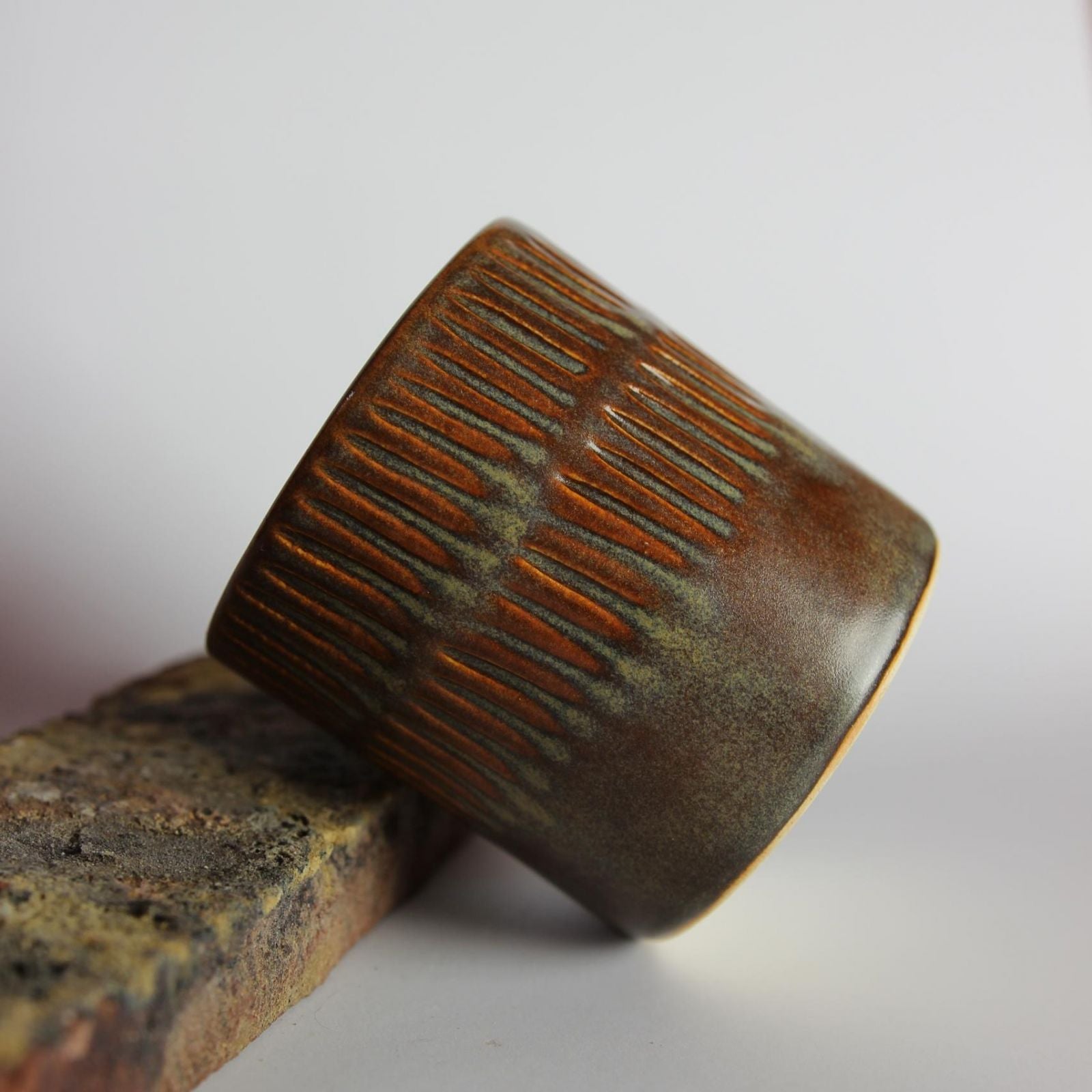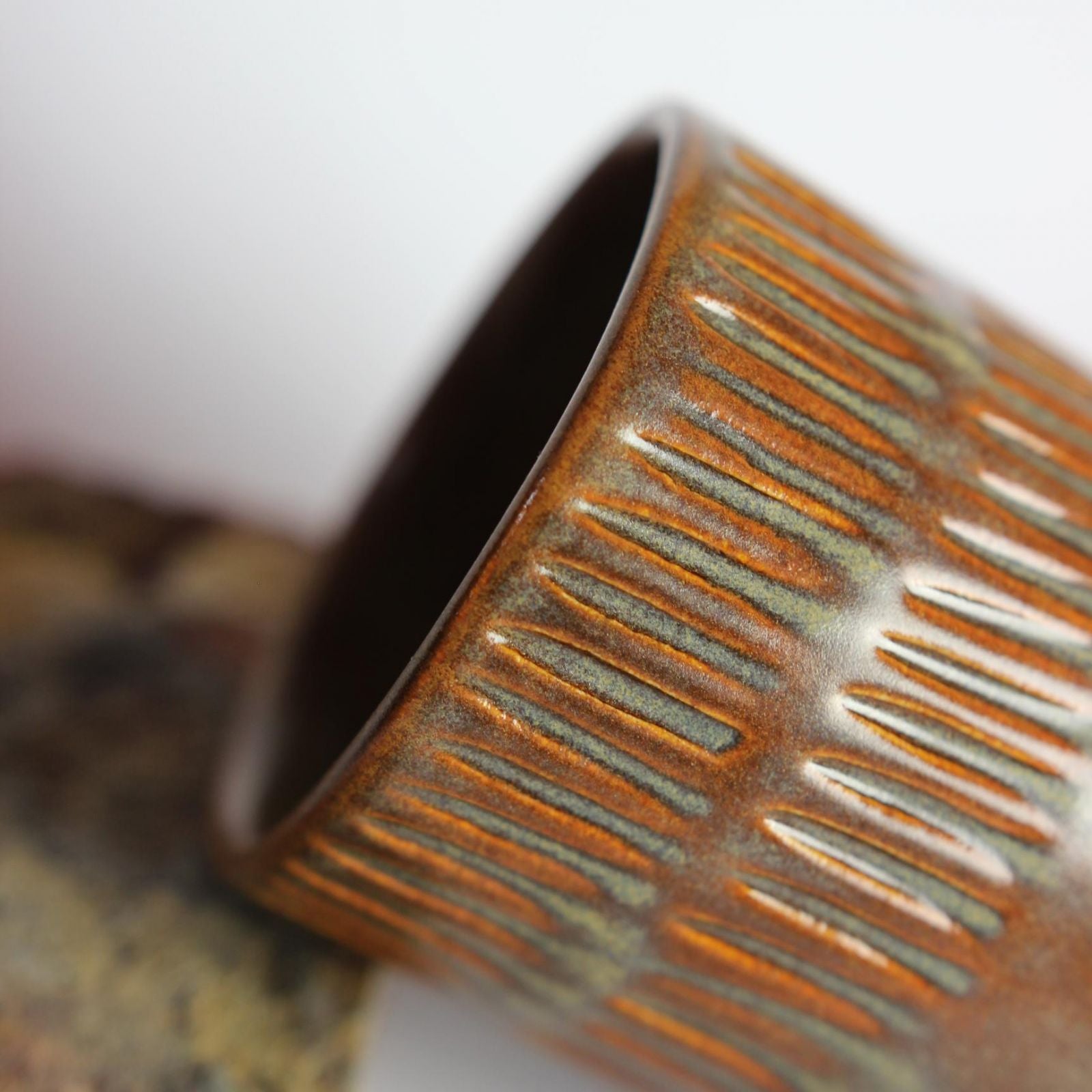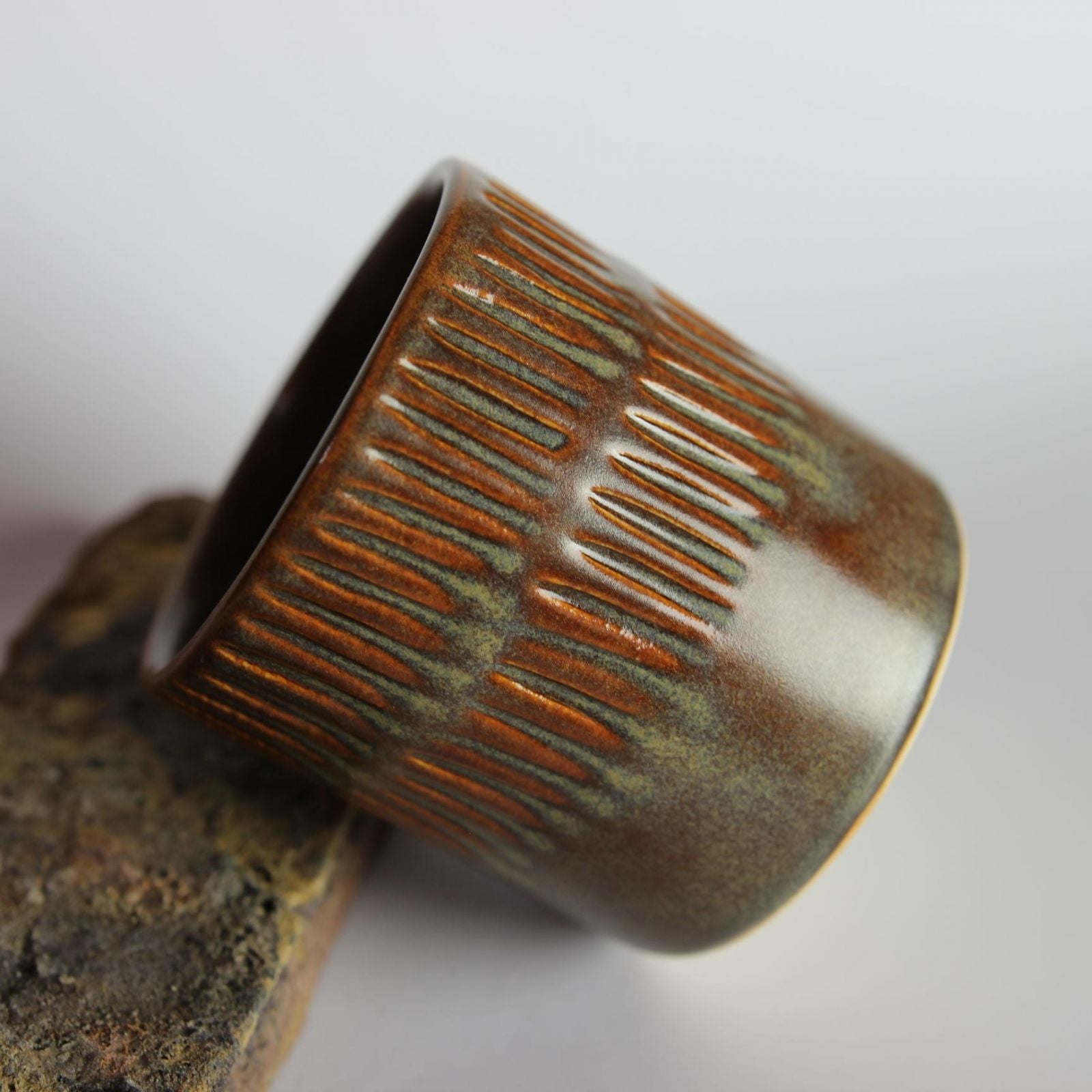 Naczynie zostało wykonane z gliny kamionkowej i pokryte szkliwem w odcieniach brązu.