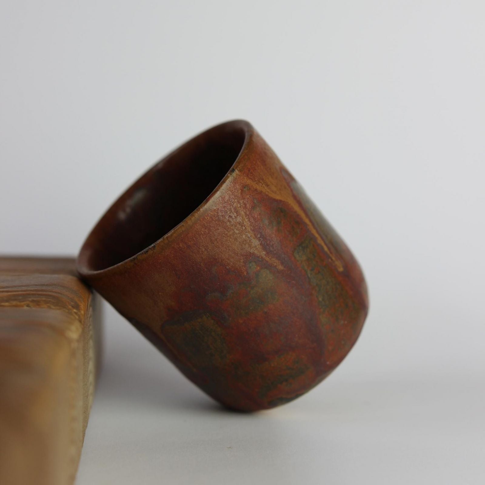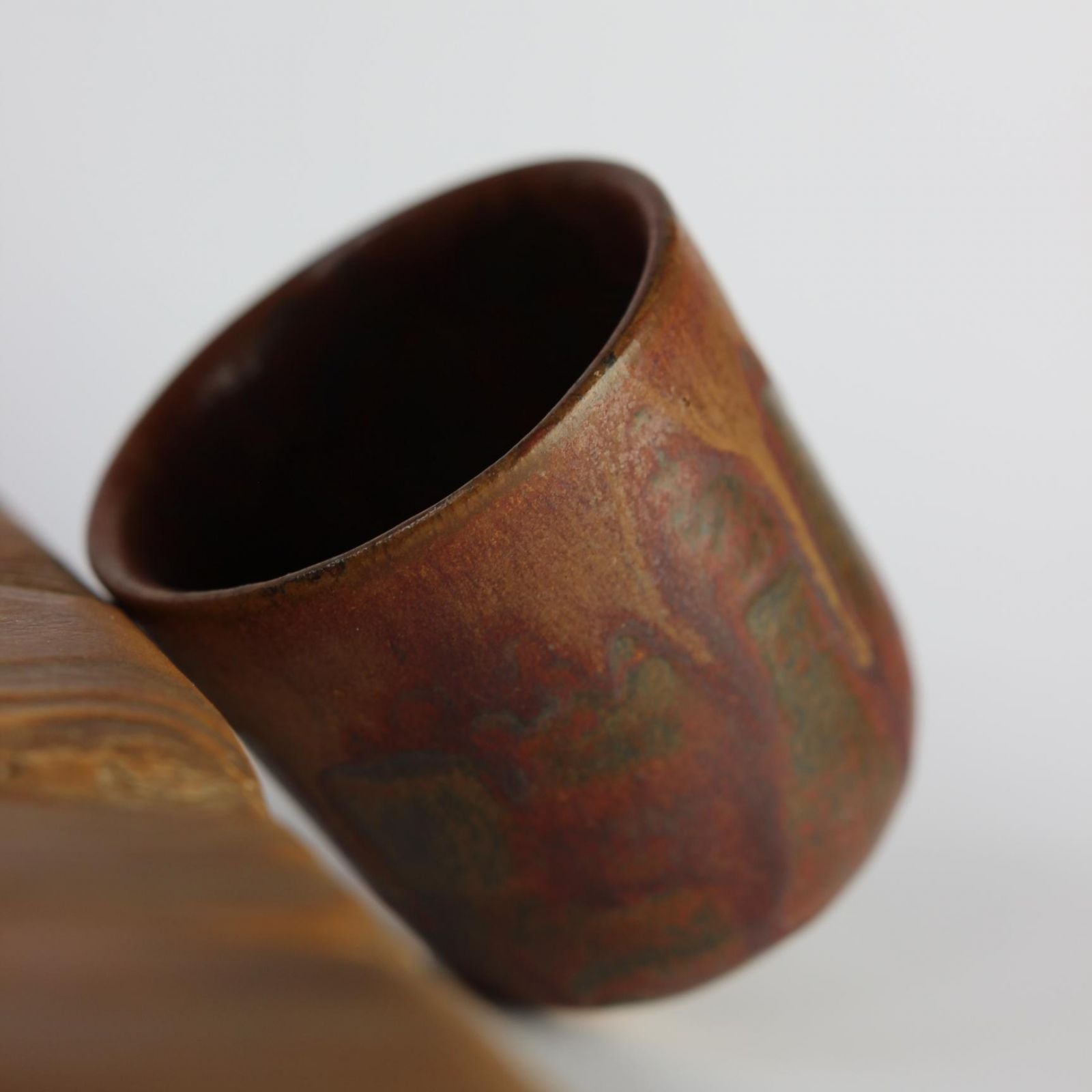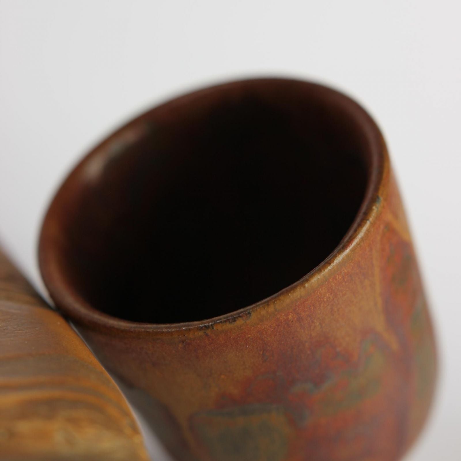 Naczynie zostało wykonane z gliny kamionkowej i pokryte szkliwem o fakturze satynowej w odcieniach brązu, czerni i bordo.
