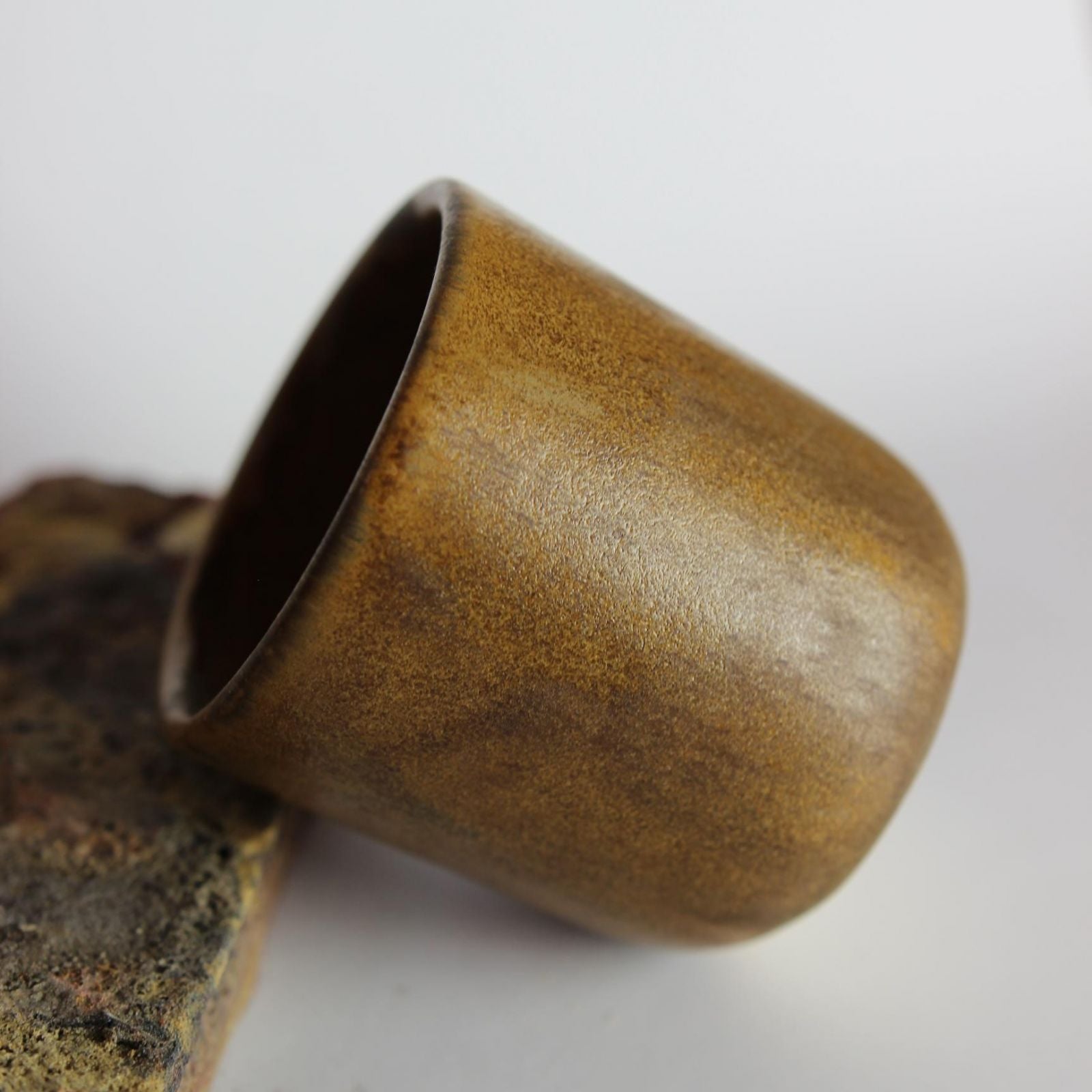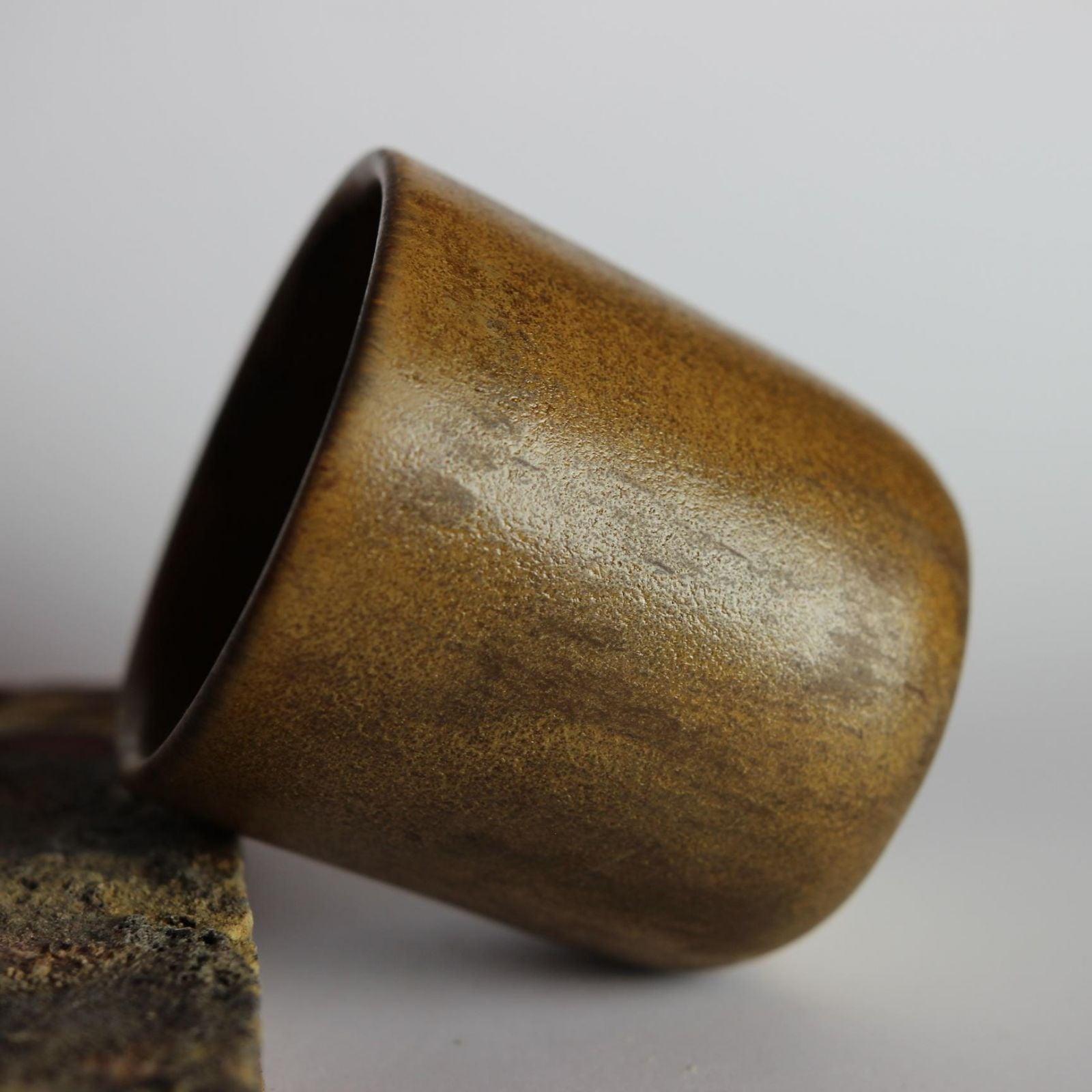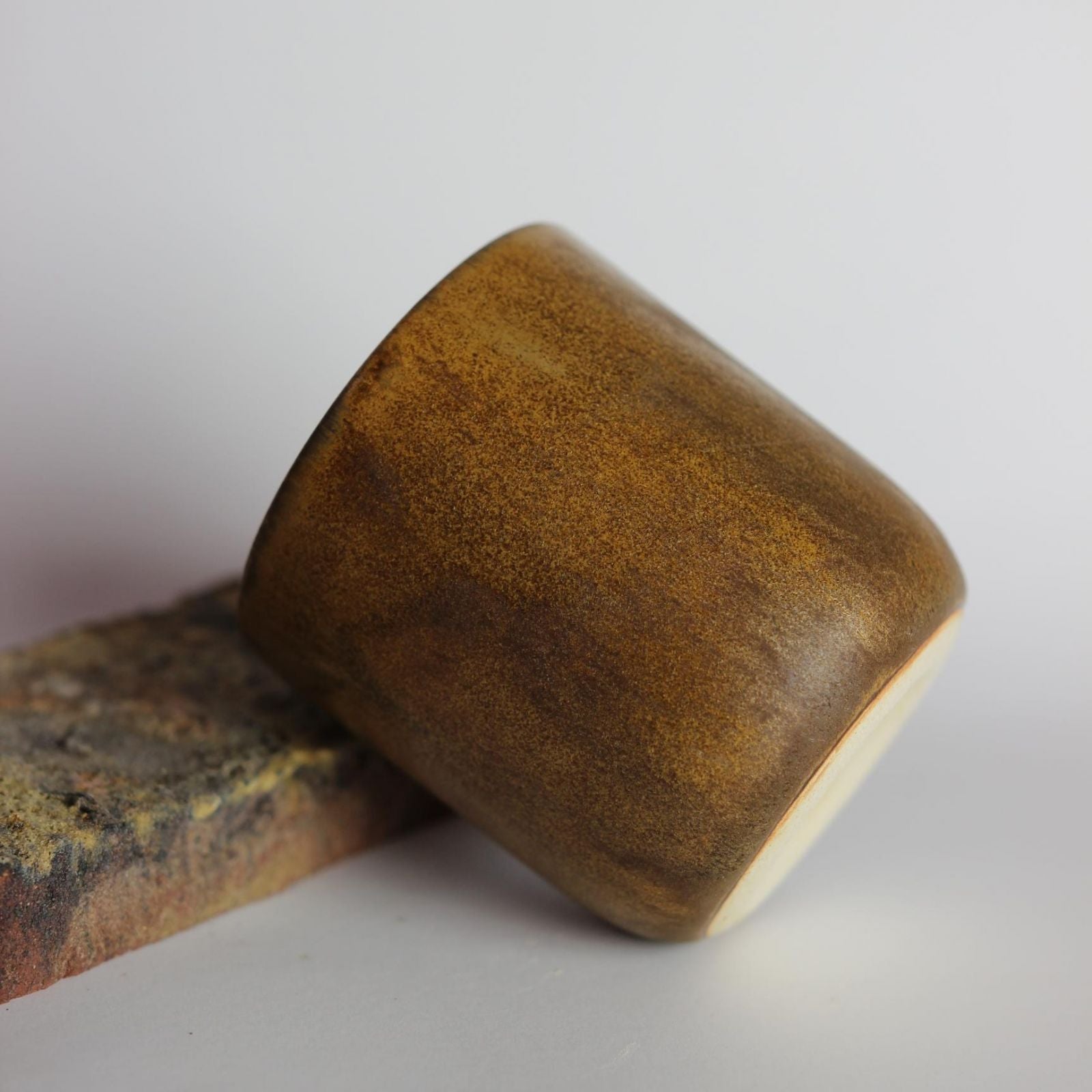 Naczynie zostało wykonane z gliny kamionkowej i pokryte szkliwem o fakturze satynowej w odcieniach brązu.