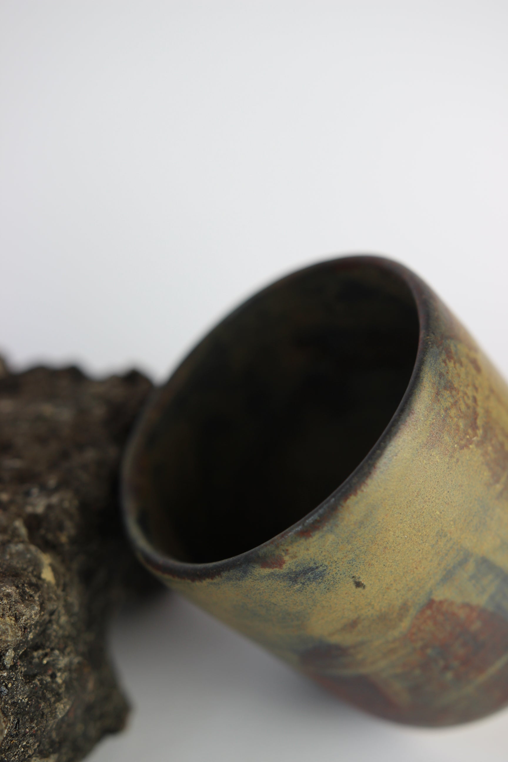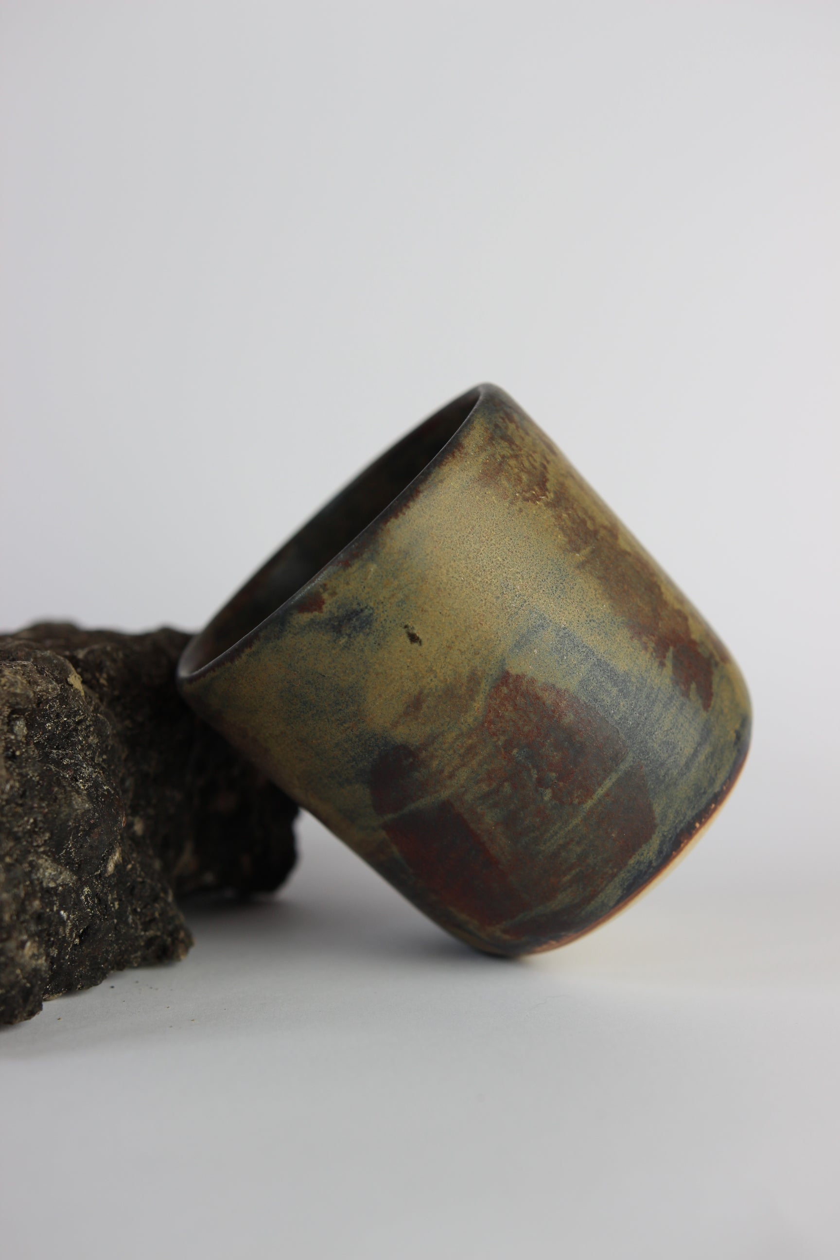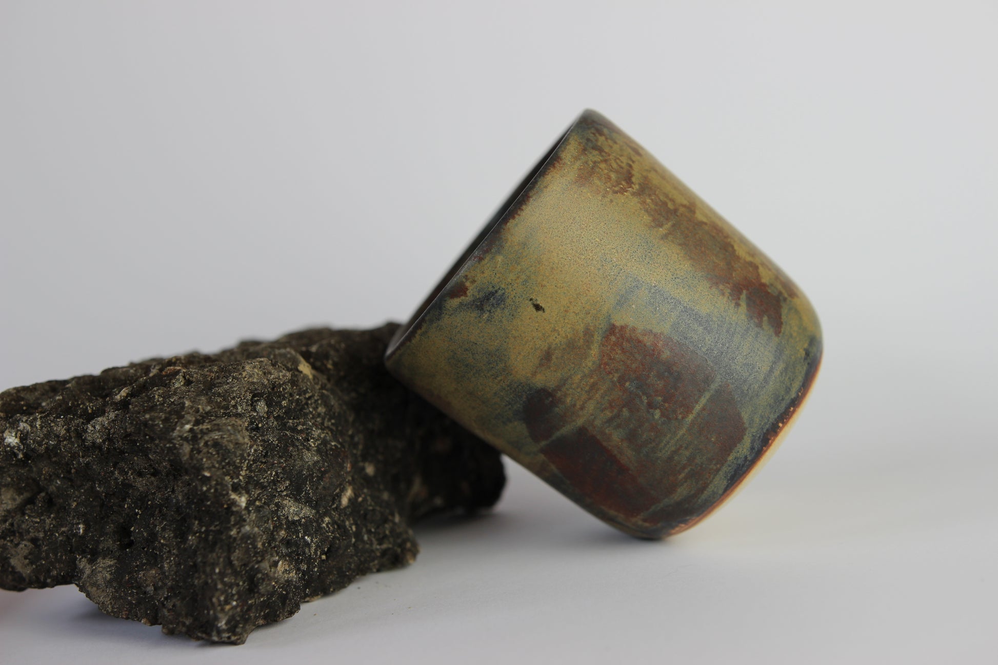 Naczynie zostało wykonane z gliny kamionkowej i pokryte szkliwem o fakturze matowej w odcieniach ziemi.
