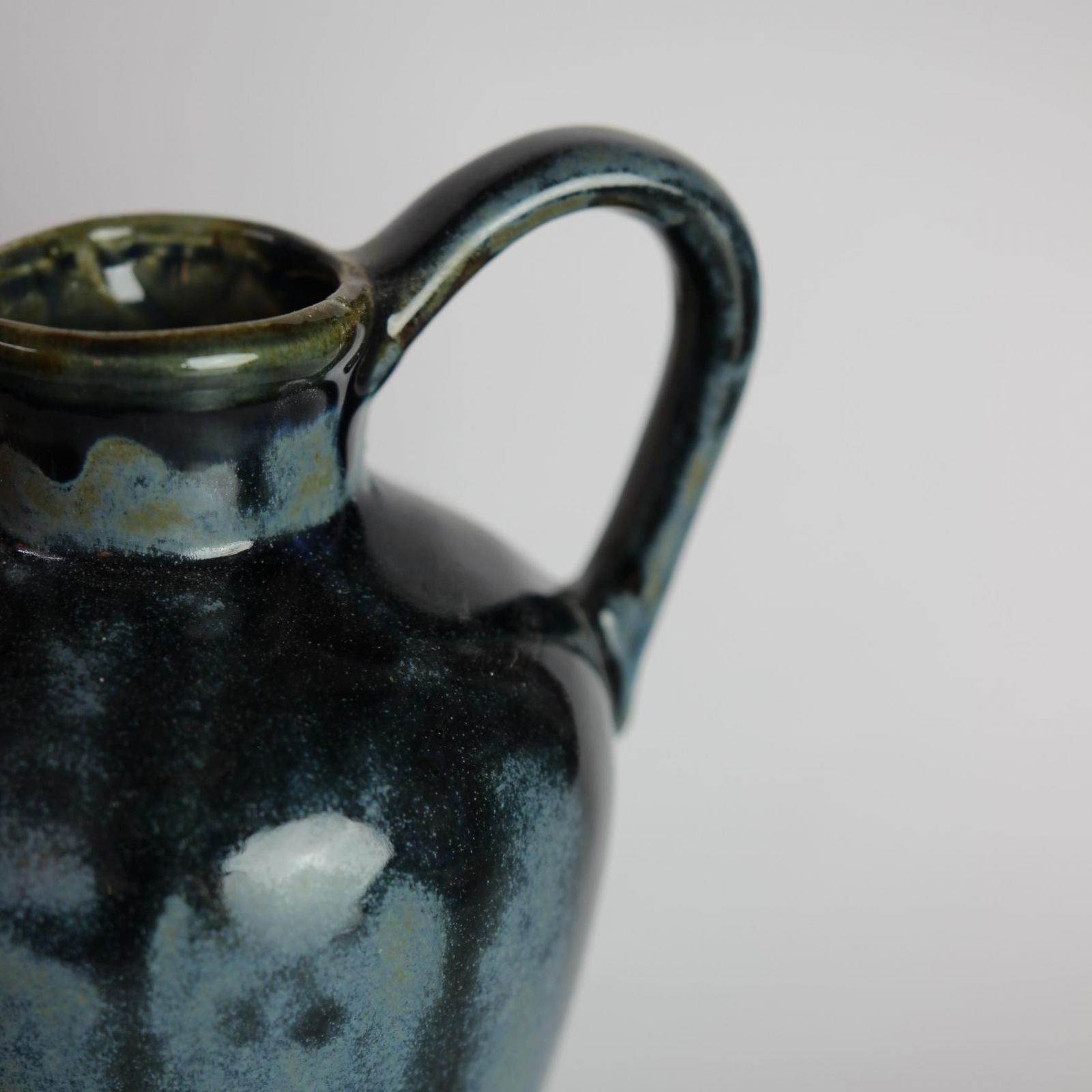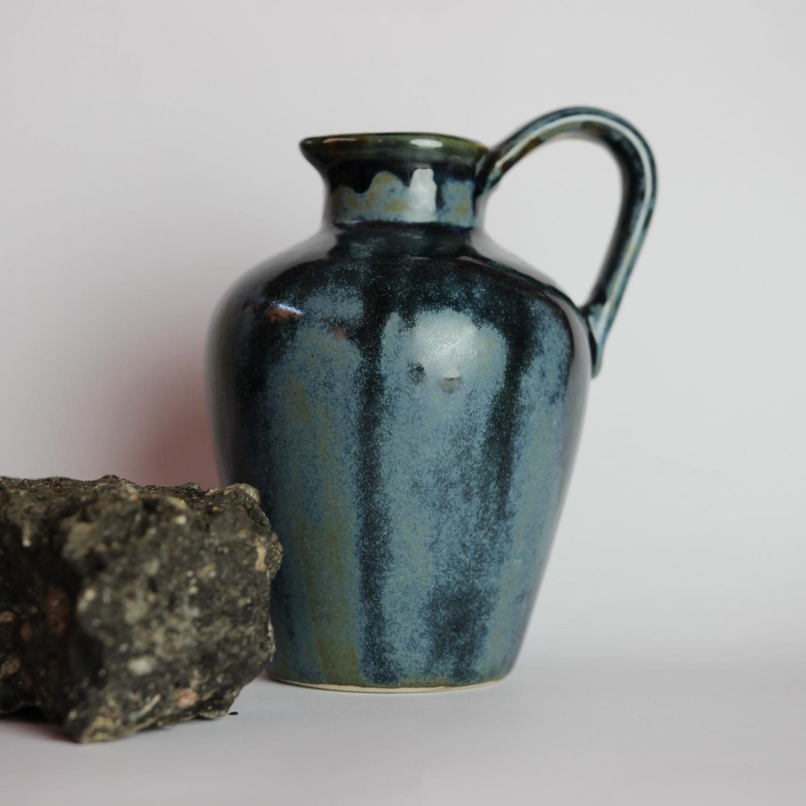 Naczynie zostało wykonane z gliny kamionkowej i pokryte szkliwem o fakturze satynowej w odcieniach głębokiego granatu.