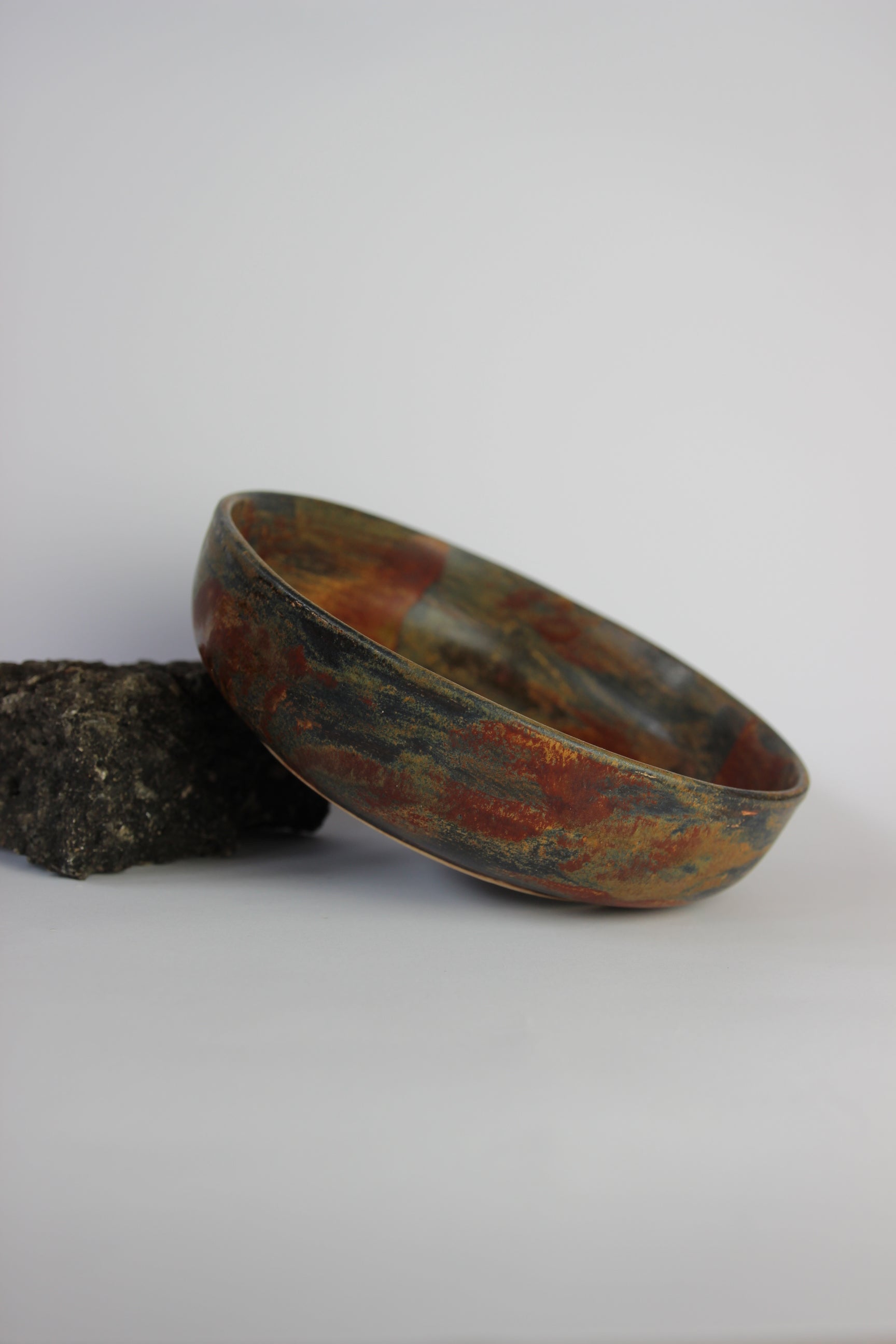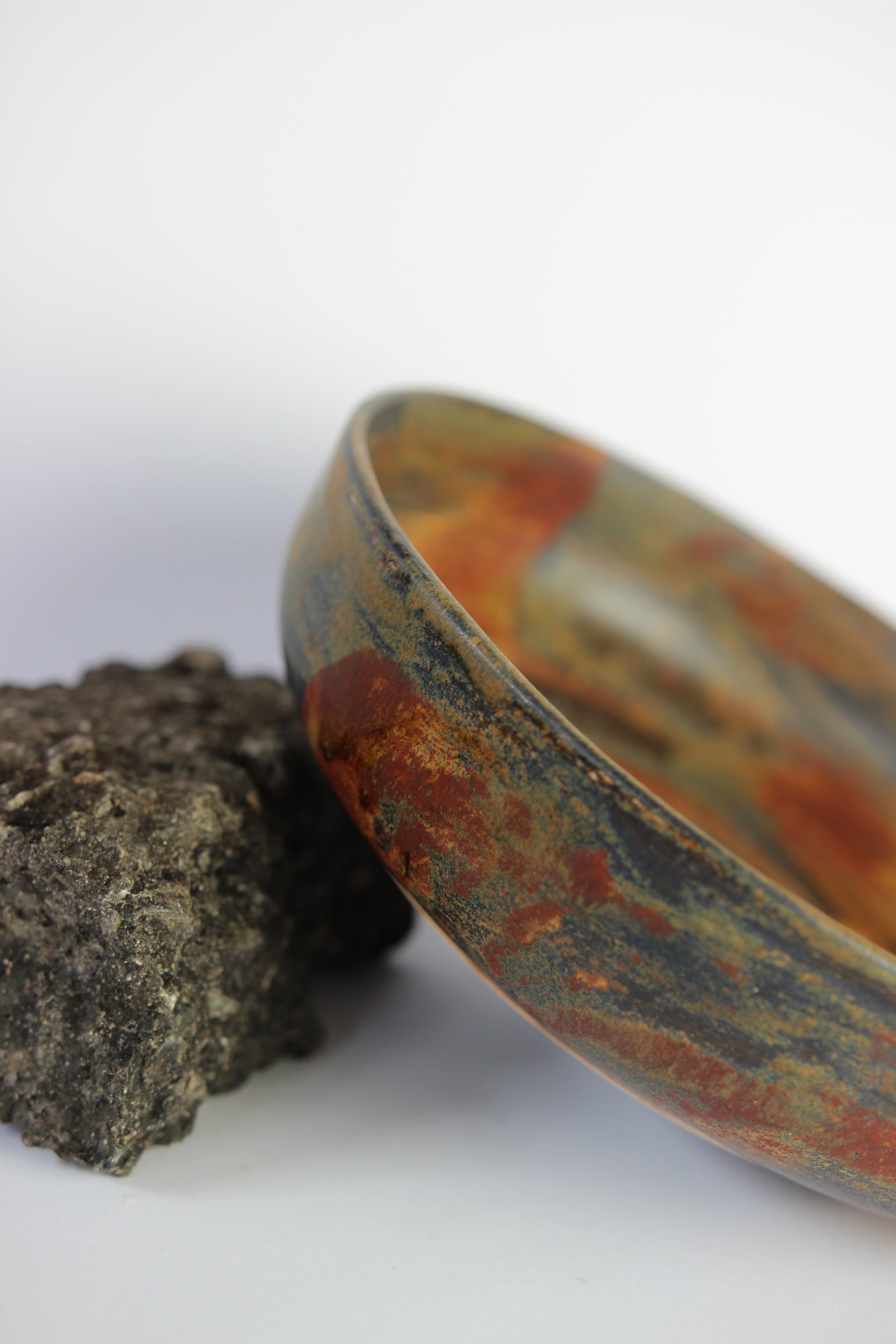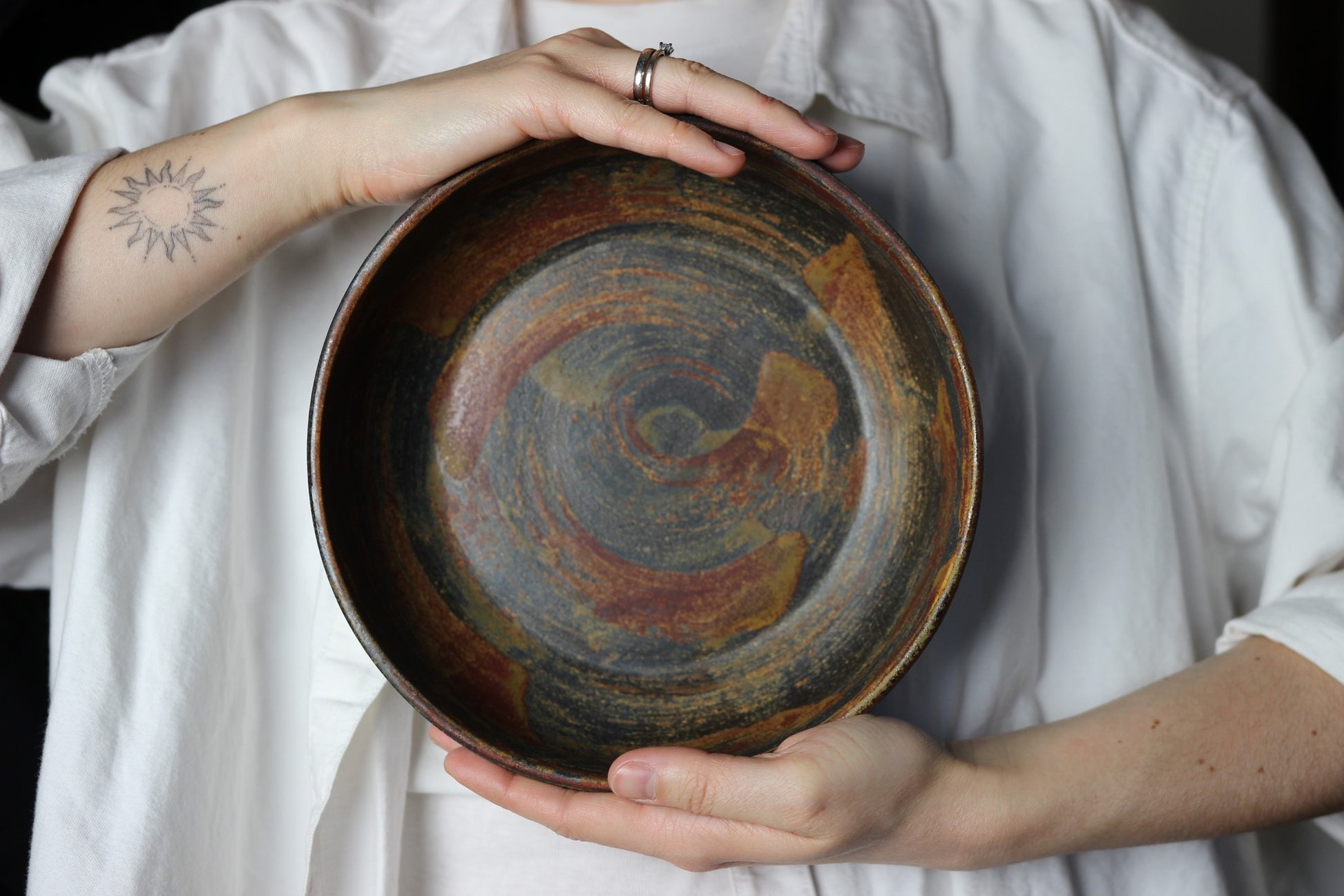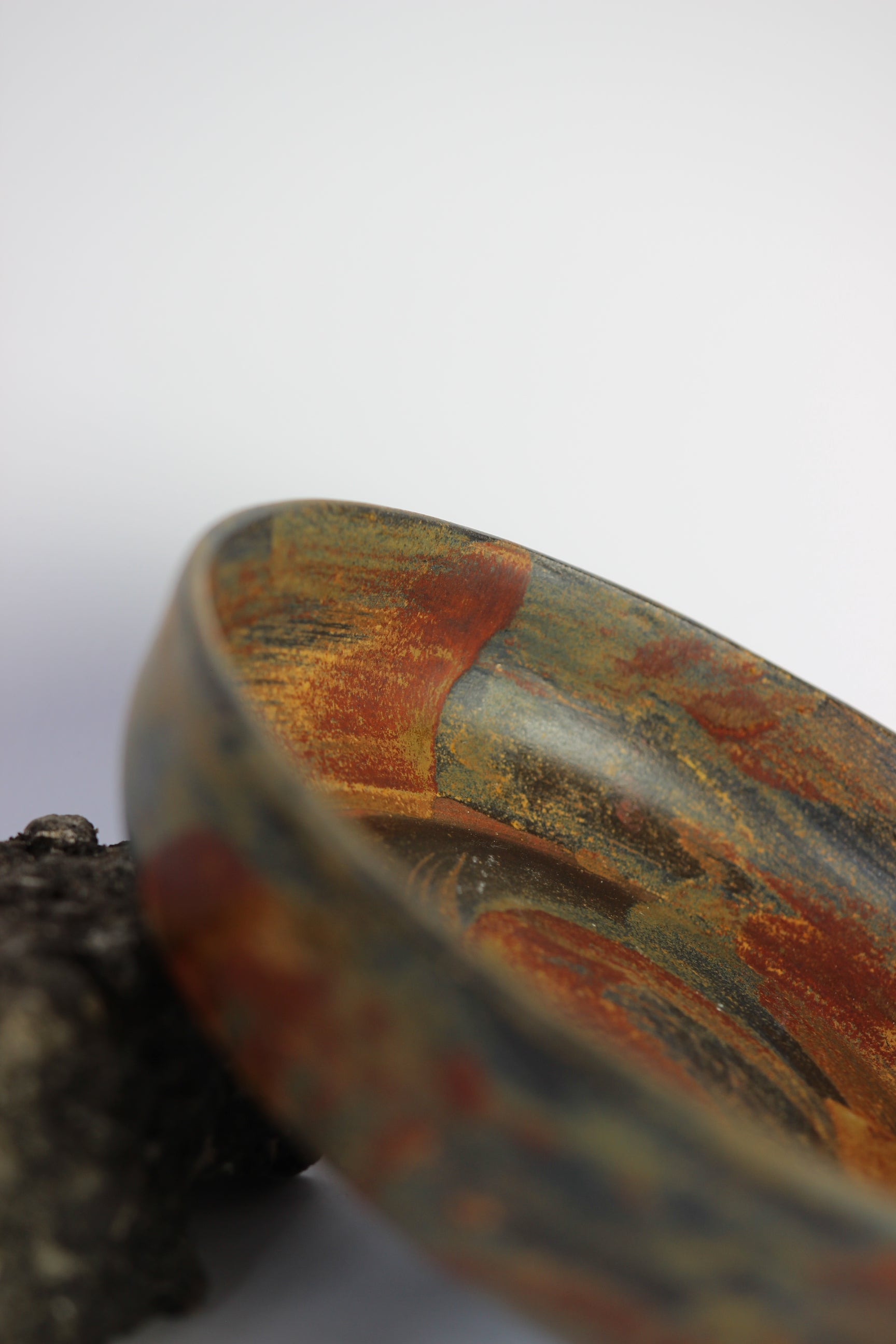 Naczynie zostało wykonane z gliny kamionkowej i pokryte szkliwem w odcieniach głębokiego brązu, czerni i czerwonego.