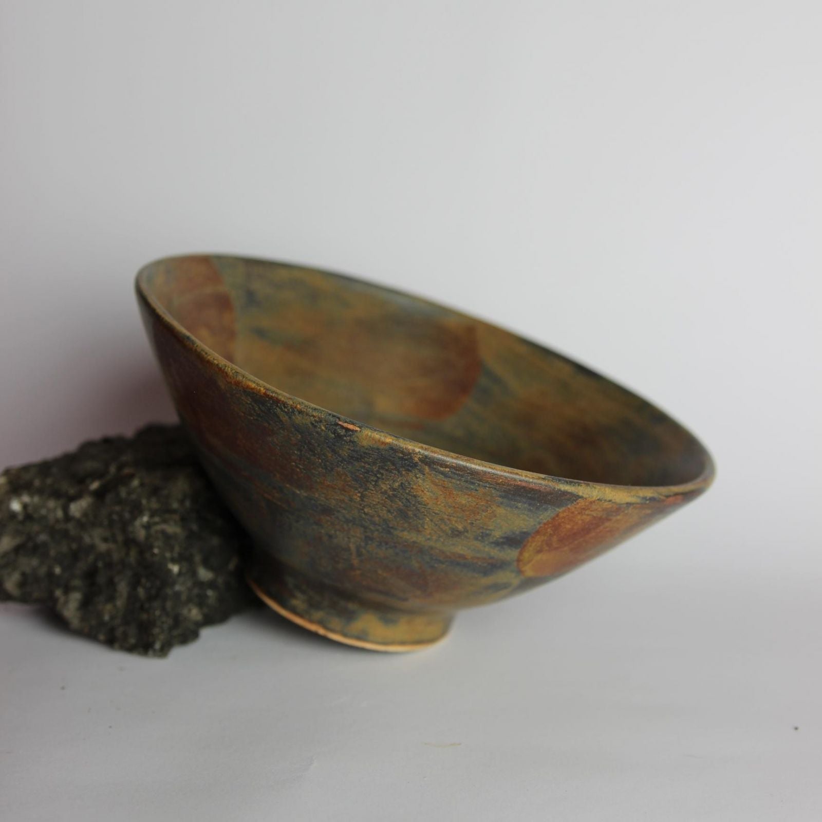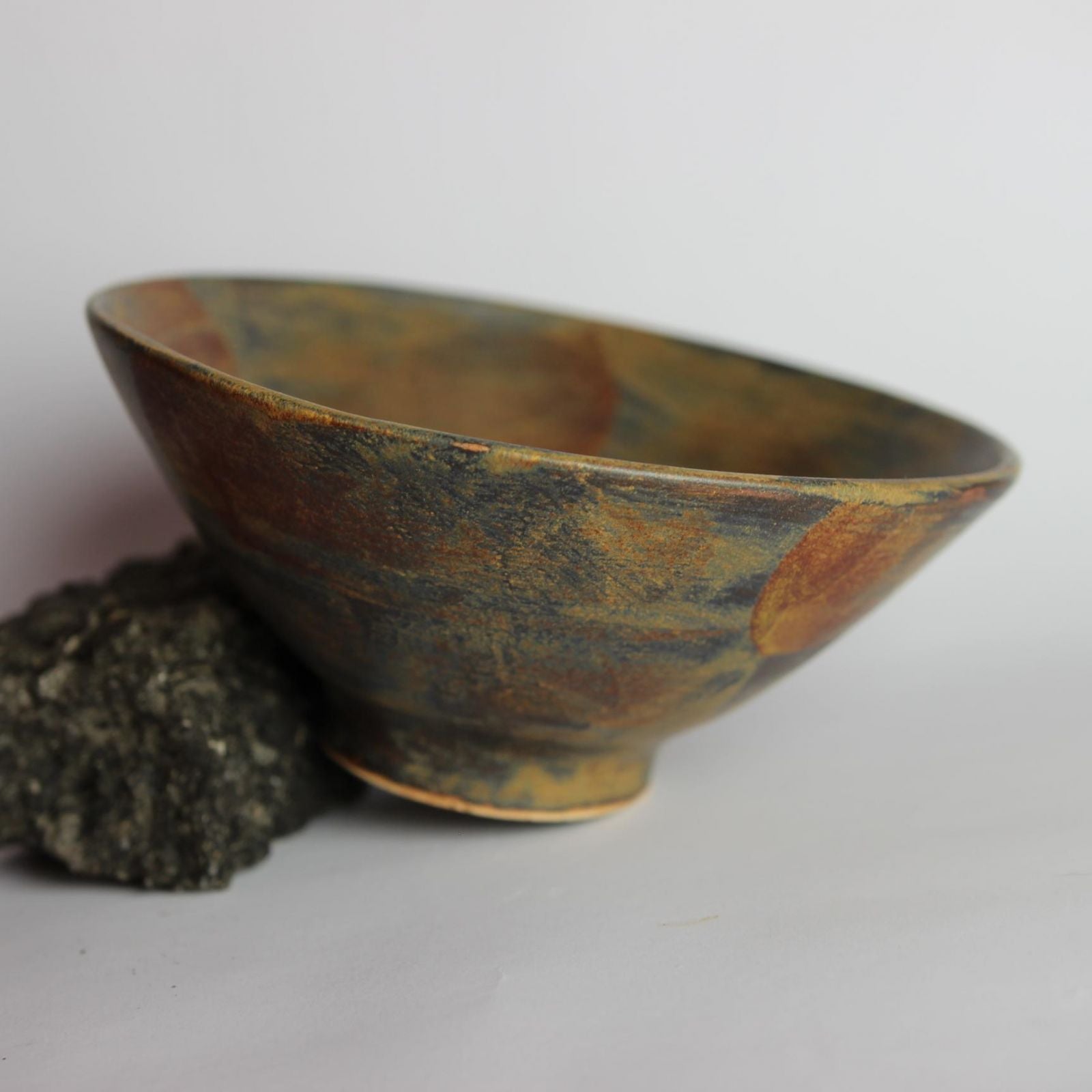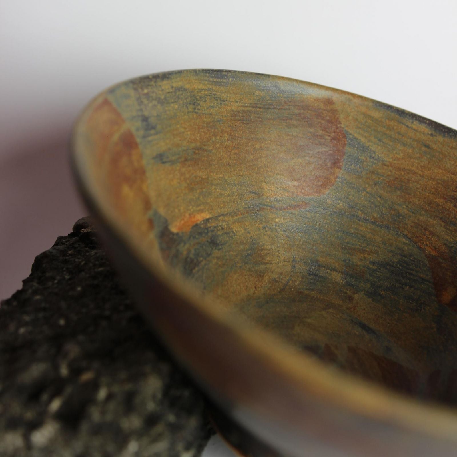 Naczynie zostało wykonane z gliny kamionkowej i pokryte szkliwami matowymi w odcieniach ziemi.