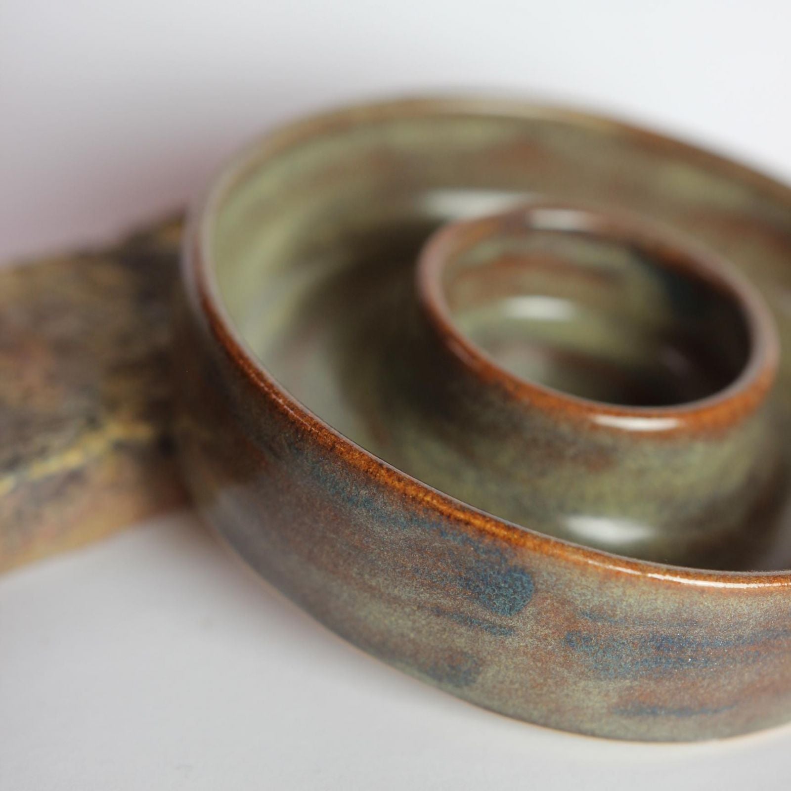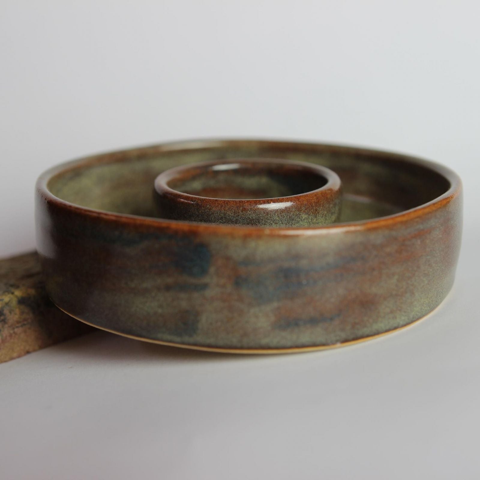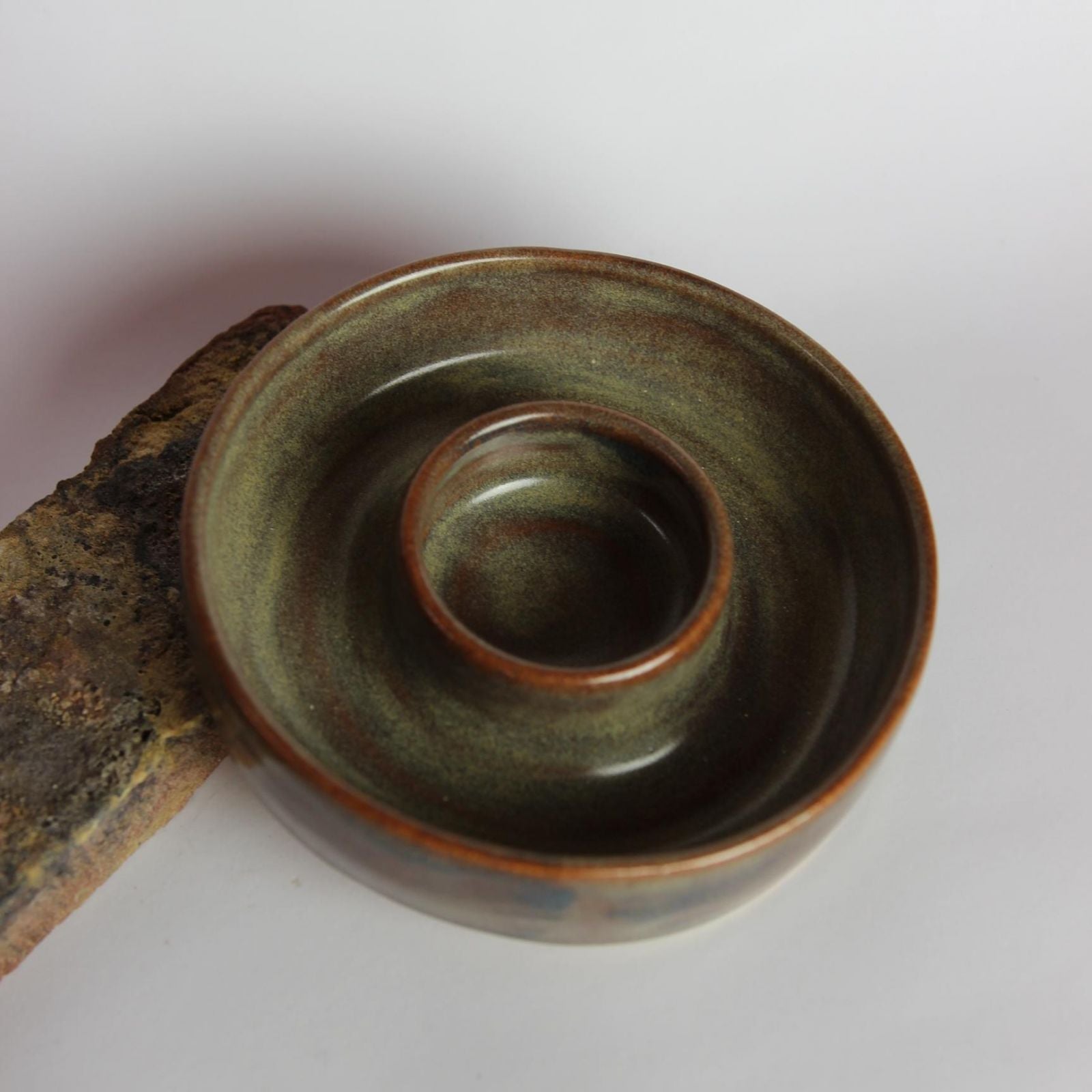 Naczynie zostało wytoczone z gliny kamionkowej i pokryte szkliwem w odcieniach głębokiego brązu z ciemnymi przebarwieniami.