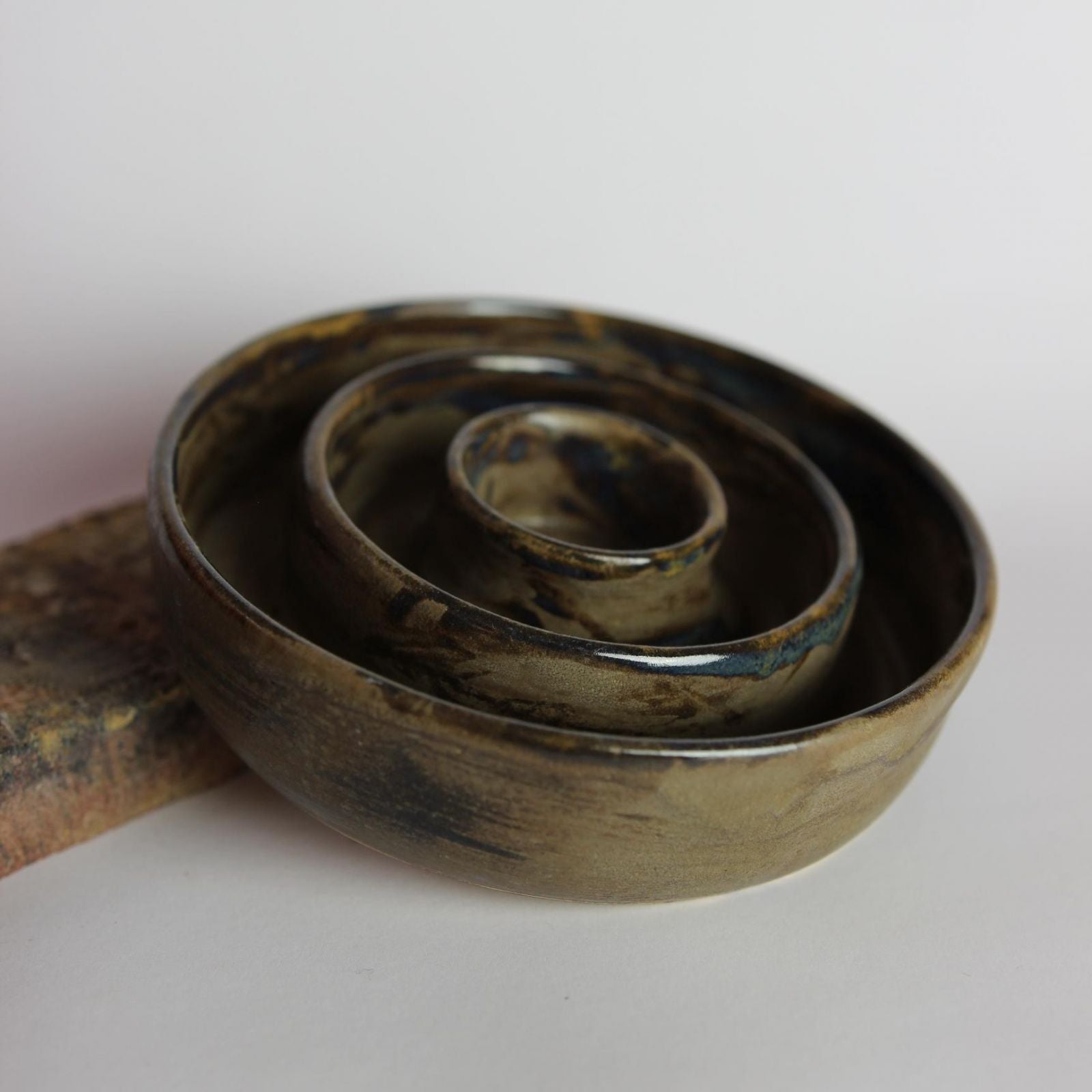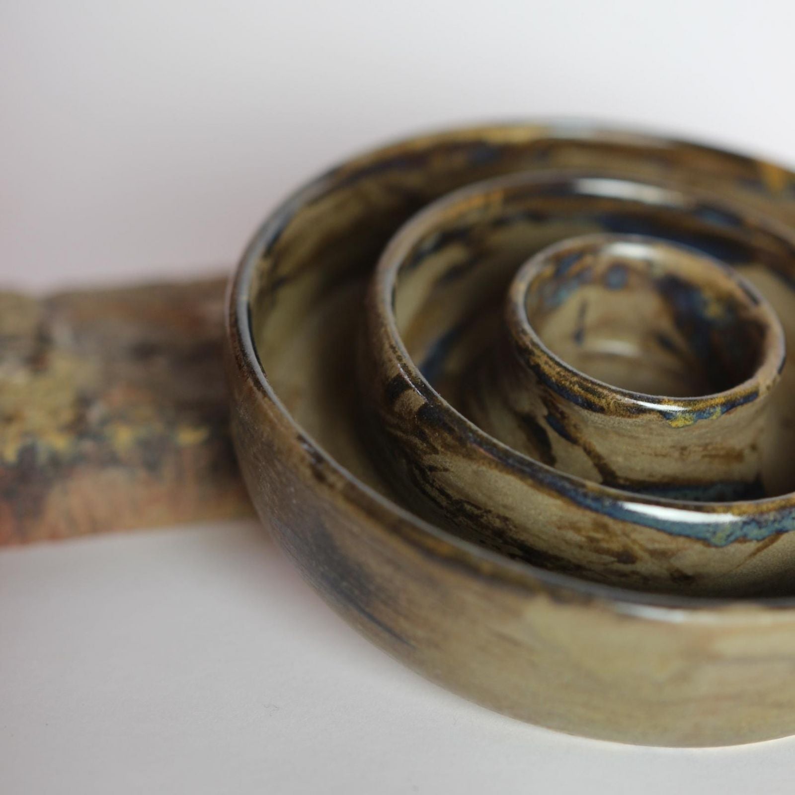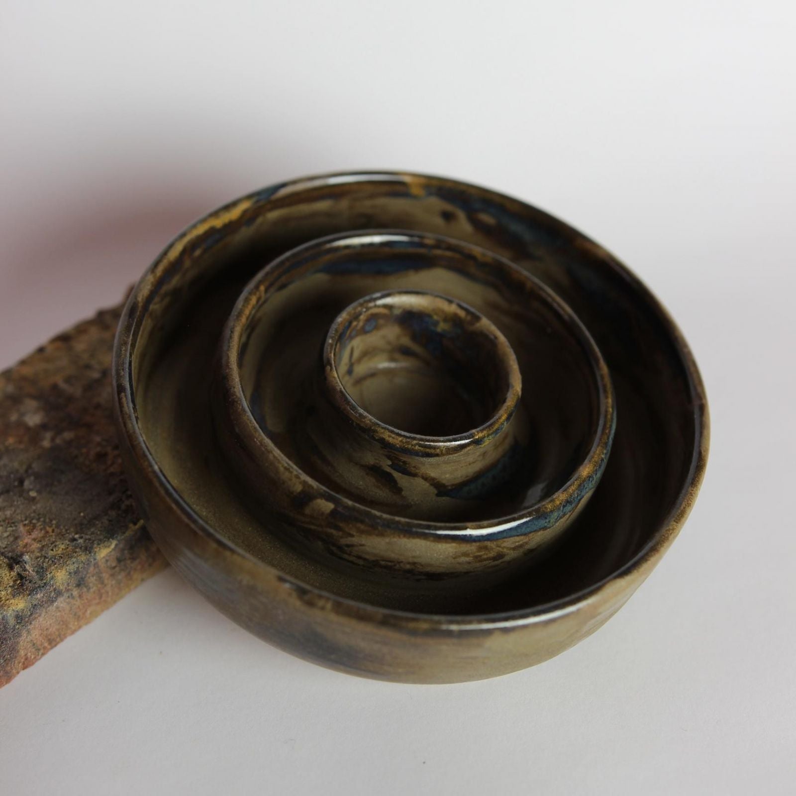 Naczynie zostało wytoczone z gliny kamionkowej i pokryte szkliwem o głębokim, ciemnozielonym odcieniu z czekoladowymi przebarwieniami.