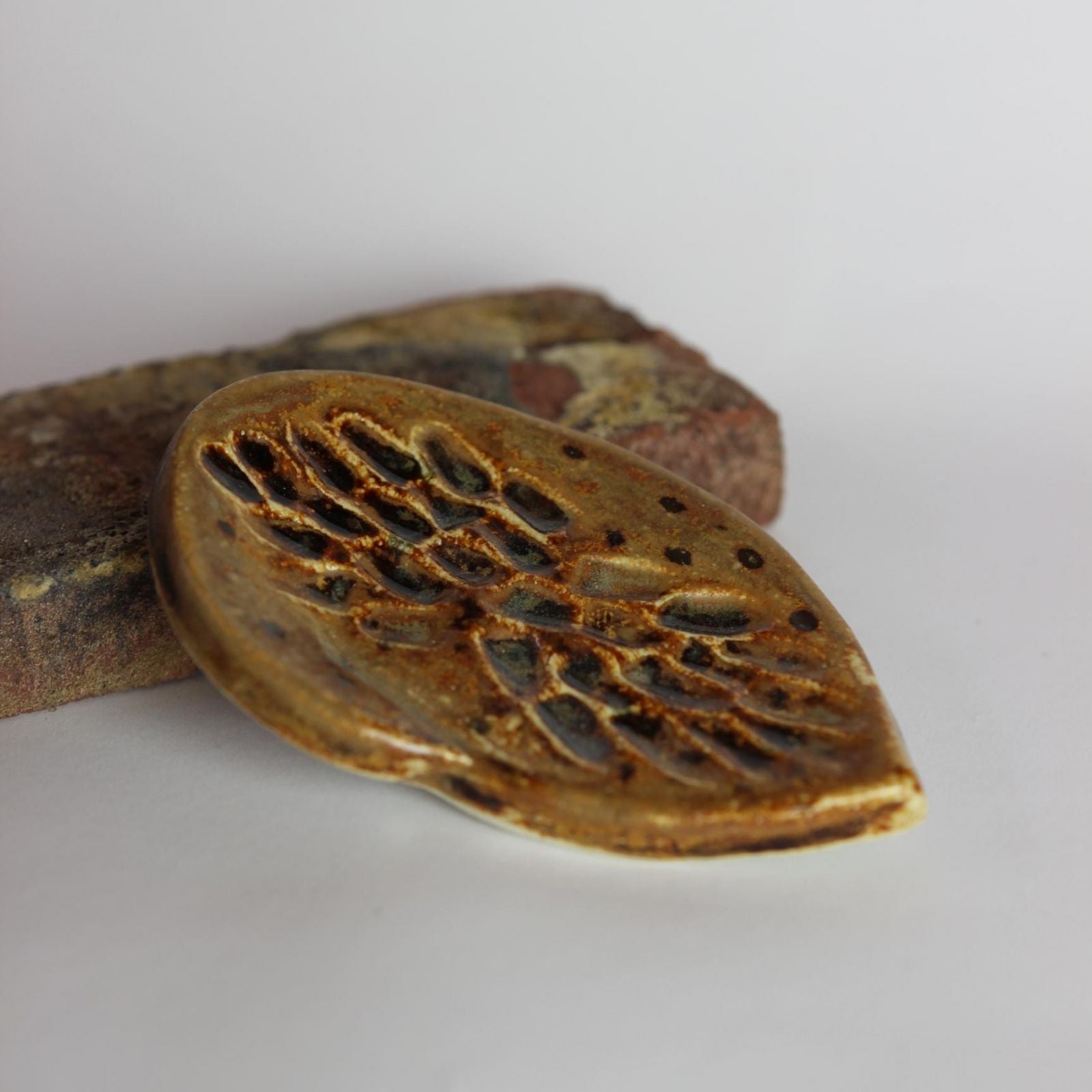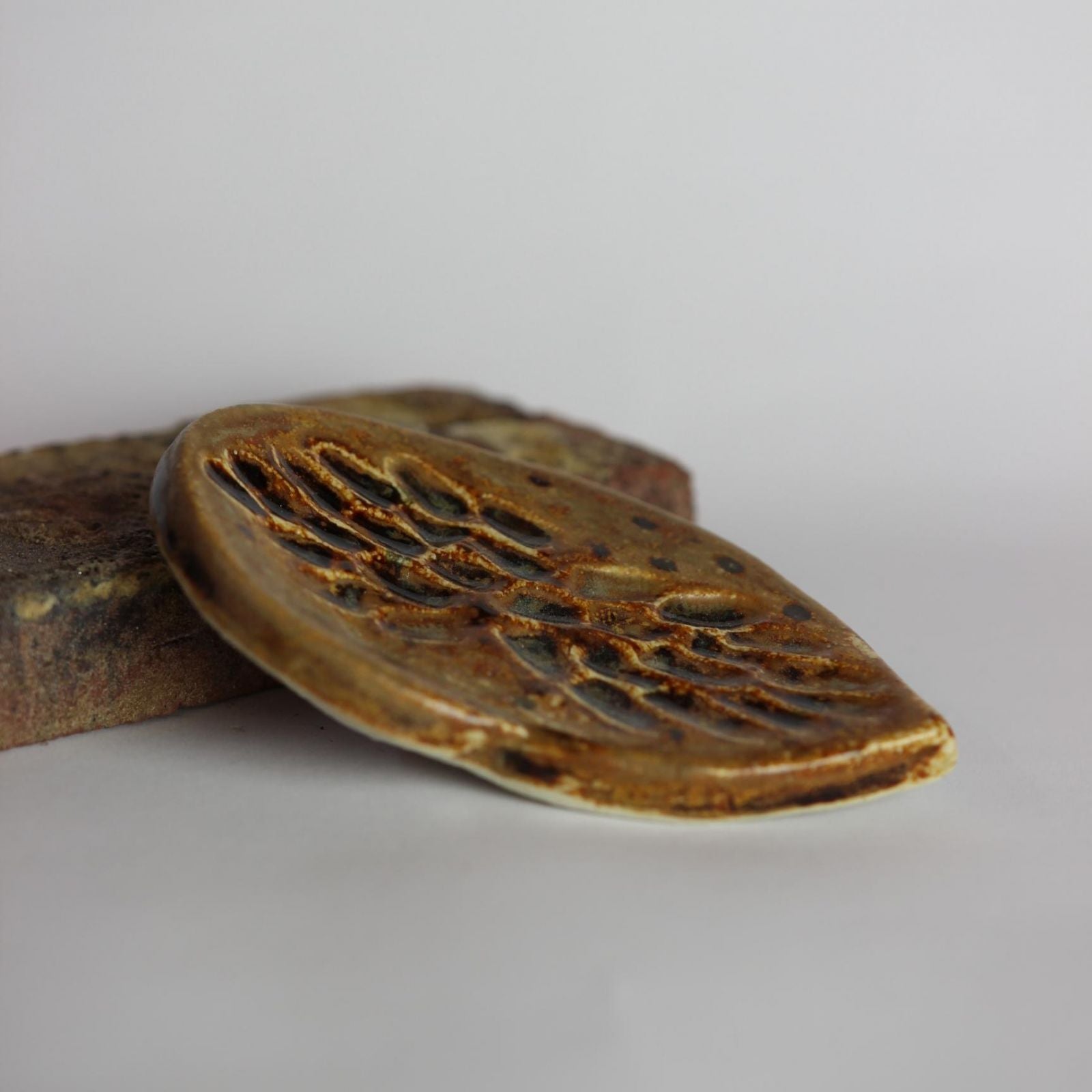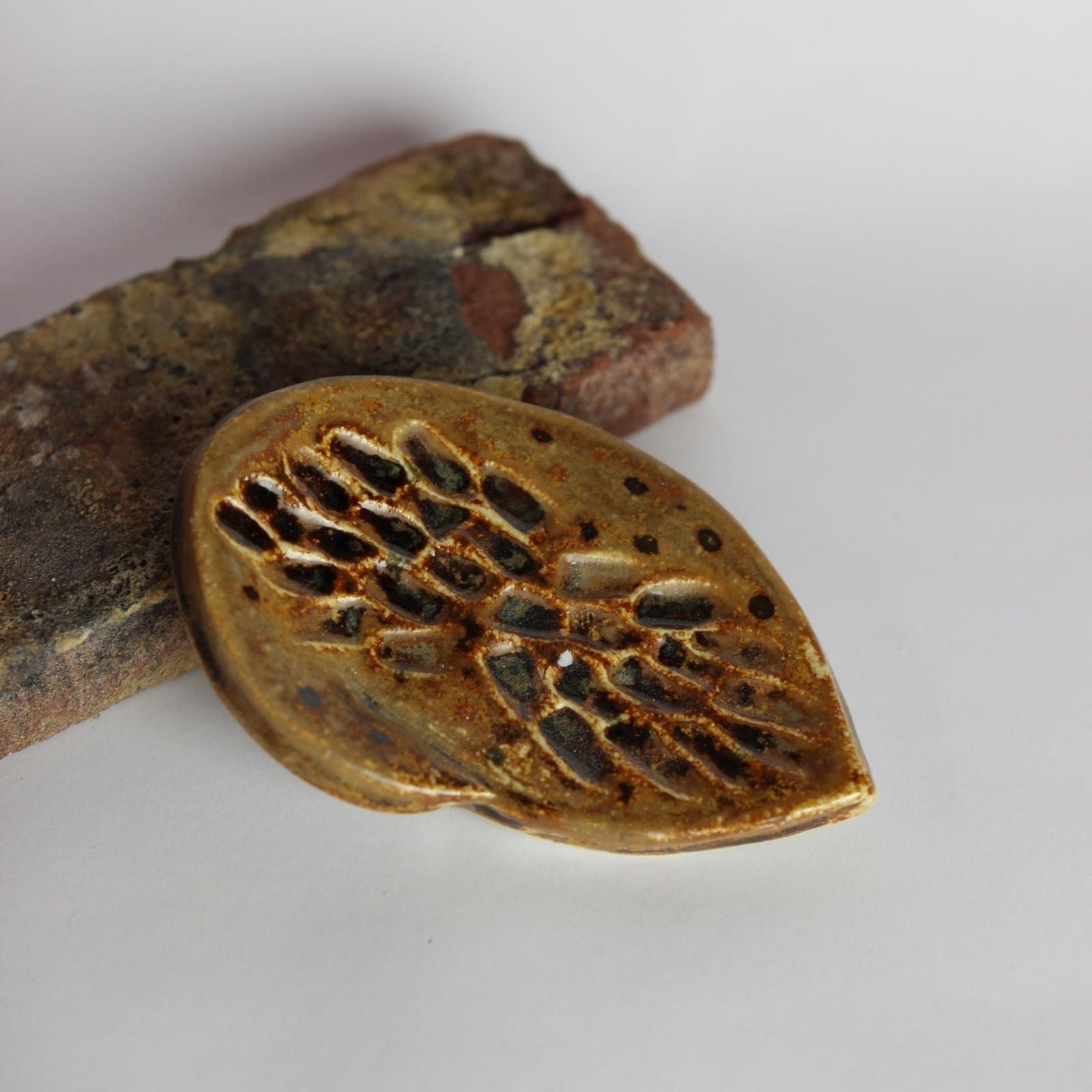 Łapka została wykonana z gliny kamionkowej i pokryta szkliwem o fakturze satynowej w odcieniu musztardowych oraz brązu w błysku.